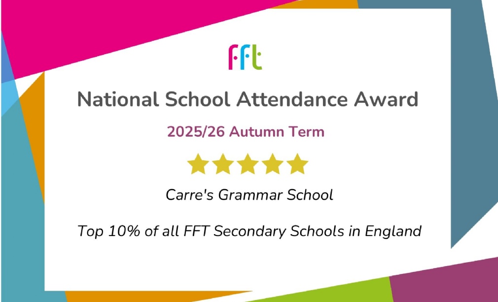 We’re proud to announce that Carre's Grammar School has been recognised once again in the top 10% of all FFT schools nationally for attendance (2025–26).
