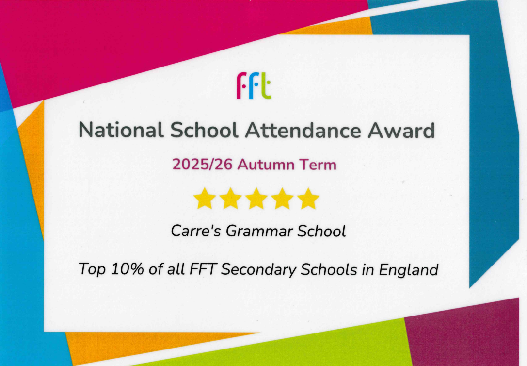 We’re proud to announce that Carre's Grammar School has been recognised once again in the top 10% of all FFT schools nationally for attendance (2025–26).