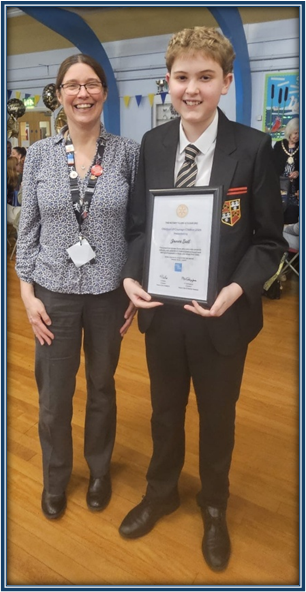 James is pictured receiving his award with Mrs Wilson, Assistant Headteacher, who attended the ceremony on behalf of the school.